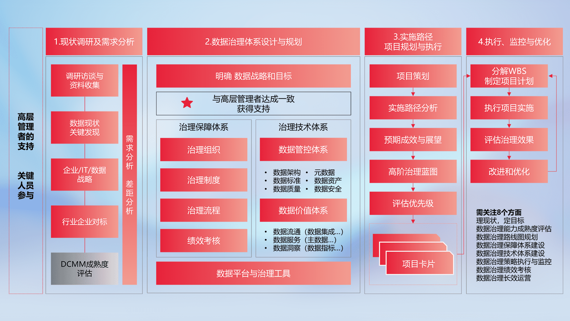 制定并执行统一的数据标准,,,规范数据定义和格式,,,,消除冗余和不一致性,,,实现跨部门和跨系统的数据一致性,,,,为企业提供标准化的数据基础。。