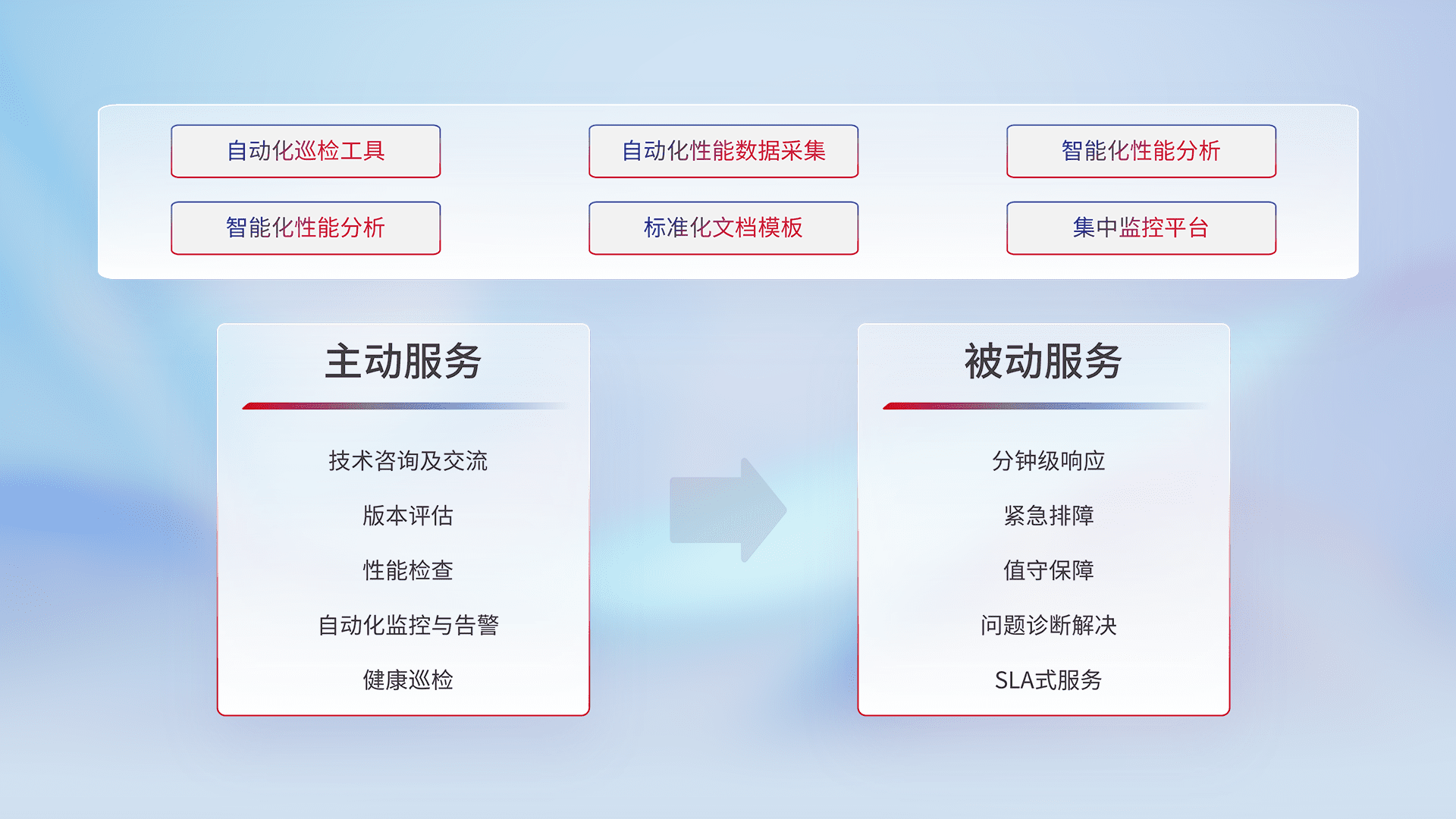 智能化工具和标准化文档,,,,保障服务质量,,,,提供主动服务(包含技术咨询、、、版本评估、、、性能检查、、、、自动化监控与告警、、、健康巡检)和被动服务包含(分钟级响应、、、紧急排障、、、、值守保障、、、问题诊断解决、、、SLA服务)。。。